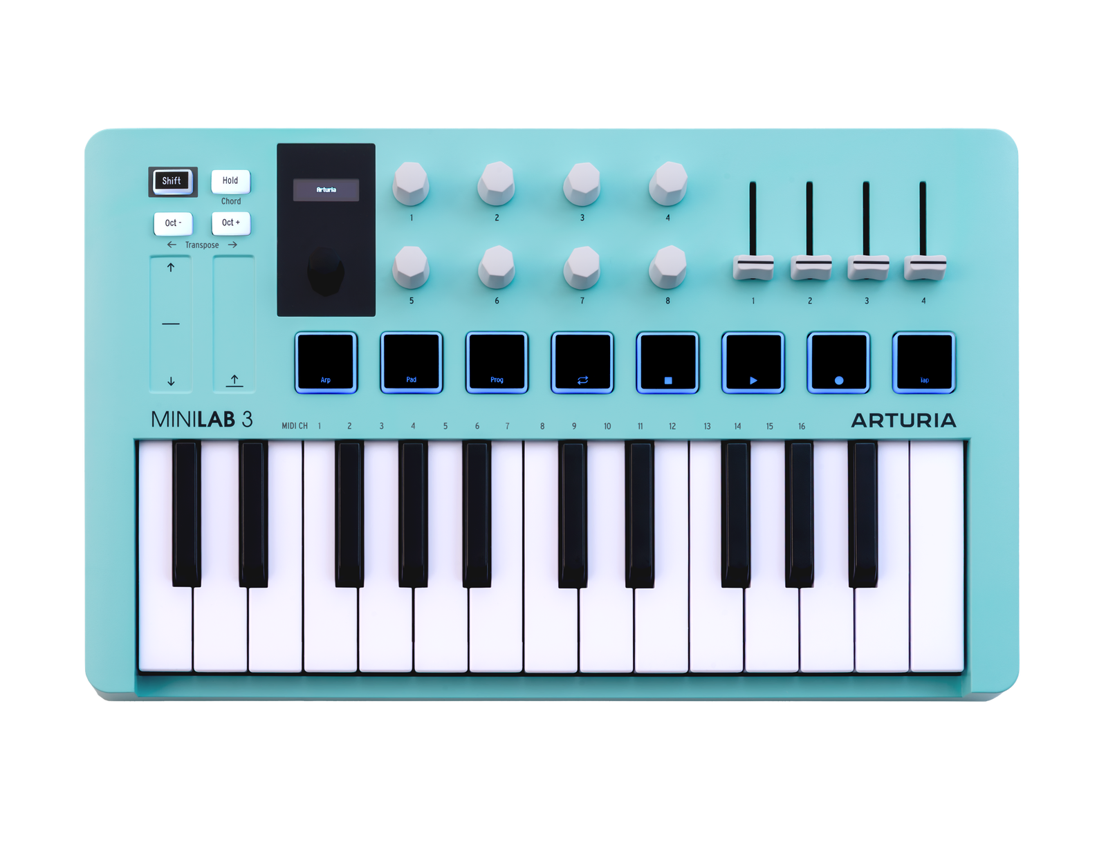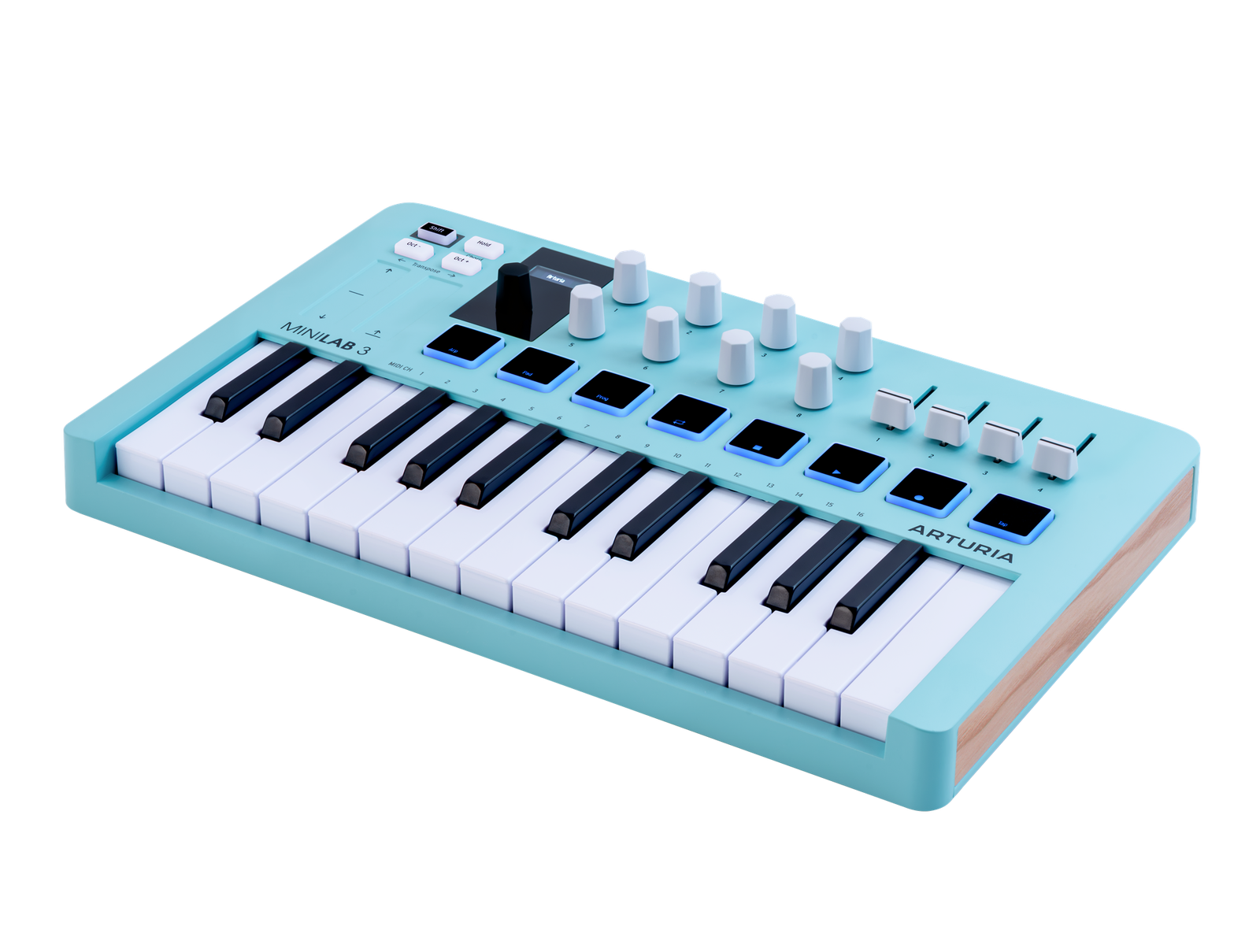 The Arturia Minilab MK3 makes music accessible to everyone with just a few clicks and brings together the hands on experience of digital music production and portability for today's music producer with no experience or music background needed. Control all your beats, rhythms, melodies, loops and mixes on your DAW from this one midi/USB keyboard controller. With the included software and 1000s of sounds included this product from ANALOG LAB INTRO, Ableton Live Lite, The Gentleman (Piano), MODEL D, Loopcloud and MELODICS, the Arturia MINILAB MK3 offers a diverse library from the classic analogue synth sounds to today's digital sounds. Easy to use with limitless possibility this product is perfect for both Keyboardists, Electric sound producers, DJ, Drummers, Video Producers and more, and perfectly suited for the studio or stage. OXYGEN MUSIC is proud to stock a range of Arturia products, including the MiniLab MK3 25 Key USB Controller in Limited Ed. Aquamarine. Also Available in White, Black, Rose Quartz.