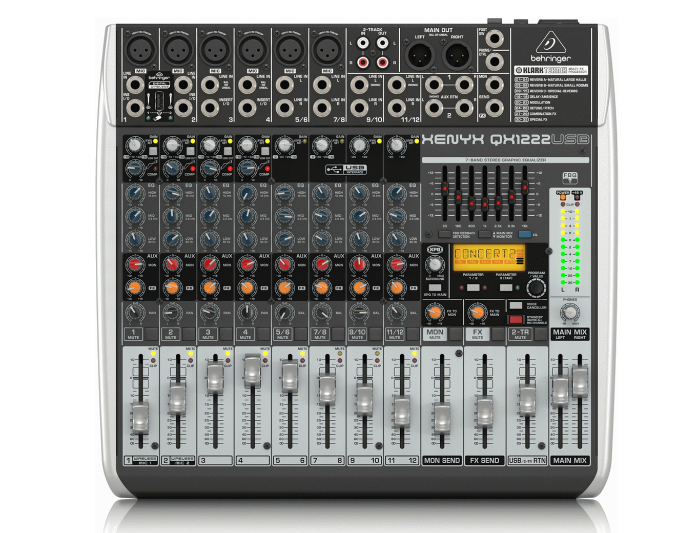Making your mix easy and flexible, the Behringer Xenyx QX1222USB is loaded full with useful functions that makes it the ultimate USB mixer of choice for all medium to large PA systems or project studios. Featuring 4 high quality Xenyx mic preamps (ch 1-4) and 2 of the 4 stereo channels also accepting XLR, 2 aux sends per channel: 1 pre fader for monitoring, 1 post fader (for internal FX and/or as external send); 2 multi-functional stereo aux returns, monitor send, FX send, USB/2-Track return, stereo main output, the QX1222USB can accommodate from a small to medium band with ease. With built in single knob compression integrated into the first 4 channels, you can mix with ease, knowing that dynamic range has been taken care of, and your mix will be kept under control. Take your mixes to the digital realm with the built in stereo USB interface and over 150 included instrument/plugins available from Behringer, wireless-ready for high-quality BEHRINGER digital wireless system via USB input (not included) for channels 1 & 2. Finally the built in 3 Band neo-classic 'British' parametric EQ and dedicated ultra-high quality KLARK TEKNIK FX processor with LCD display, dual-parameters, Tap tempo function and storable user parameter settings with 24-Bit Multi FX section makes for a versatile setup for precise mixing adjustments. Oxygen Music stocks a great range of Behringer products including the Xenyx QX1222USB 16 input mixer.