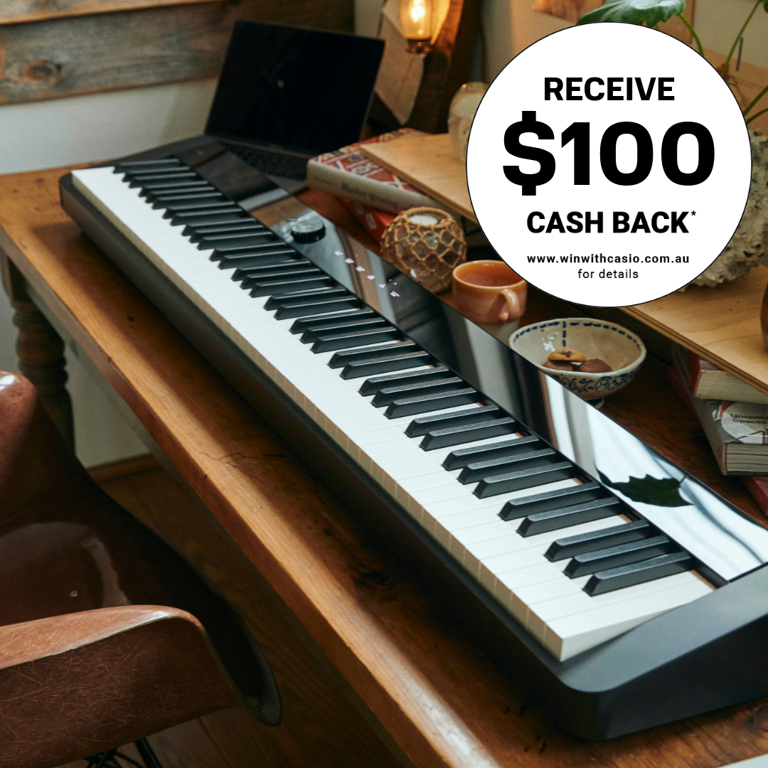 The Casio PX-S1100WE is an ultra-portable, full-size, weighted key digital piano designed to inspire musicians of all ages and abilities. The PX-S1100 places particular emphasis on simplicity compared with other pianos in the Privia series. All controls are directly in front of the user without the need to navigate through screens. The piano is loaded with 18 tones which work with the customisable Acoustic Simulator to recreate the realistic resonance of an acoustic piano. The Smart Scaled Hammer Action replicates the touch and feel of a Grand Piano, with textured to simulate the feel of ebony and ivory. This piano features the ability to run entirely off of 6 X AA batteries as well as regular AC power, unlocking a load of potential for the amount of places and situations this piano can be used. Some of the common functions include: layer; metronome; transpose; duet (great for education and piano duets); as well as common effects like reverb and chorus. The piano includes a Bluetooth MIDI/Audio Adaptor which allows the user to customise piano settings, playback audio, and record MIDI data through the seamlessly integrated CASIO MUSIC SPACE app for smartphones and tablets. The app also features scores which can be viewed and played. The PX-S1100WE is compatible with the three-pedal unit (SP-34), (sold separately). This specialty pedal unit can be depressed lightly to produce a half-damper sound. Oxygen Music stocks the most popular digital pianos including the Casio PX-S1100WE portable digital piano.