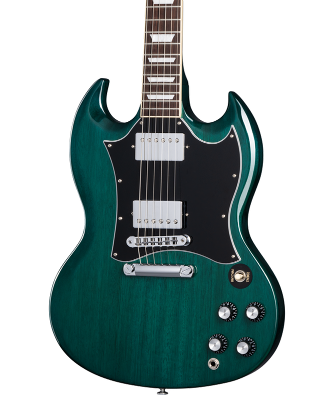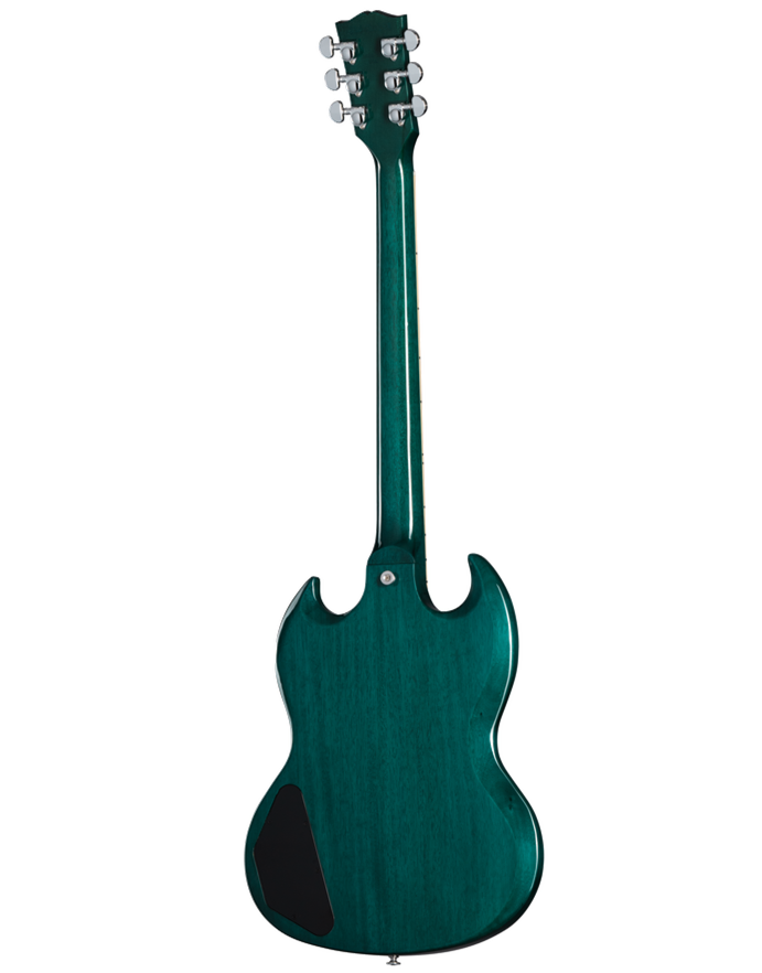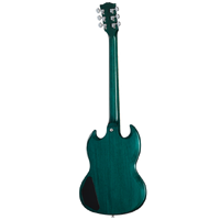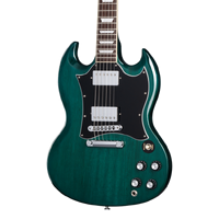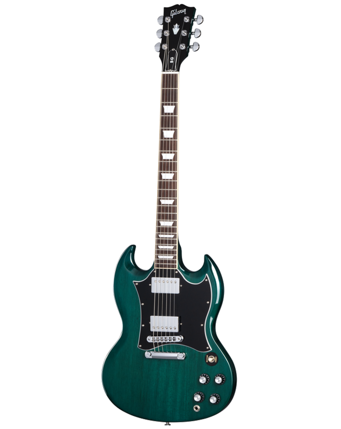It doesn't get more rock and roll than the famous Gibson SG standard. Theres a good reason why the Gibson SG is the weapon of choice for guitar greats such as ACDC's Angus Young, Black Sabbath's Tony Iommi and Comeback Kid's Jeremy Heibert to name just a few. Its powerful, it's punchy and when you dig in, it's an absolute riff machine, making it ideal for metal, rock and doom genres. Featuring the classic combination of the bevelled Mahogany body and Mahogany neck yields plenty of punch and power but the slimmer cut gives the SG just the right amount of bite, Indian Rosewood fretboard, ABR-1 Tune-O-Matic Bridge, Grover Rotomatic with Kidney Button Tuners, Aluminium Stop Bar Tail Piece and loaded with high powered Gibson 490 neck and bridge humbuckers with classy chrome covers, the SG Standard has a massive, roaring punch, and is the perfect companion for chunky, palm muted riffs. Wrapped up in the slick Translucent Teal finish, this SG Standard will continue to inspire for many years to come. Includes padded Gibson Gig bag. Oxygen Music stocks a great range of Gibson Guitars, including the popular Translucent Teal SG Standard.