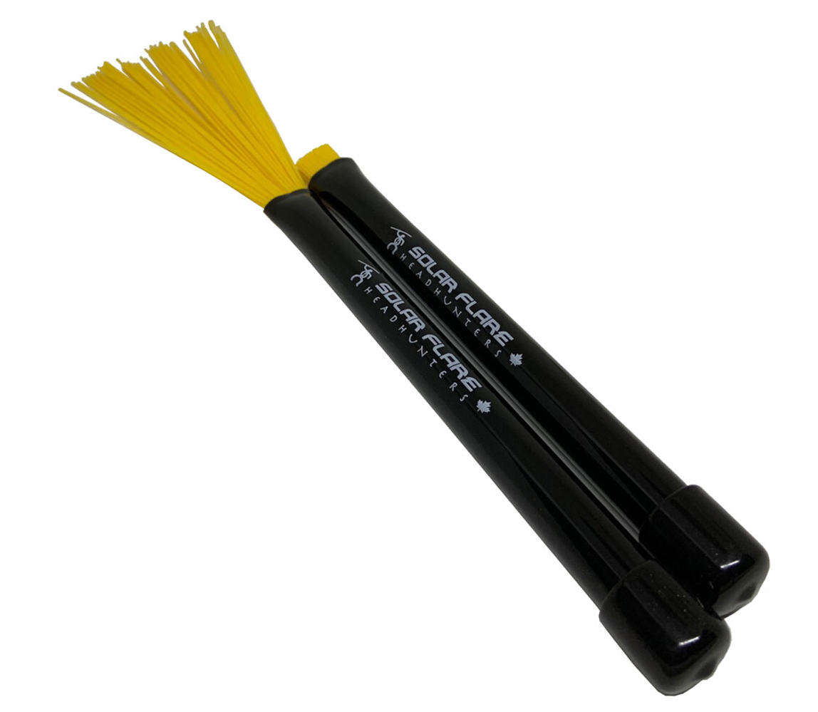 HEADHUNTERS provide drummers and percussionists with a vast selection of drumsticks, multirods, brushes and mallets to suit all levels of players and genres. These professional products are designed with the unique performer in mind looking to expand their palette of sounds and style. The HEADHUNTERS Solar Flares Nylon Brushes are a great all round, all-style, long-lasting nylon brush, featuring retractable nylon rods neatly grouped with a sturdy plastic grip handle and provide a fuller tone and attack than the wire versions, making them a perfect mix of clarity and variety of dynamic levels. Perfect brush for heavier styles with more volume and attack. Oxygen Music proudly stock a great selection of drumming multirods, brushes and mallets like these very popular Headhunters Solar Flares Nylon Brushes.
