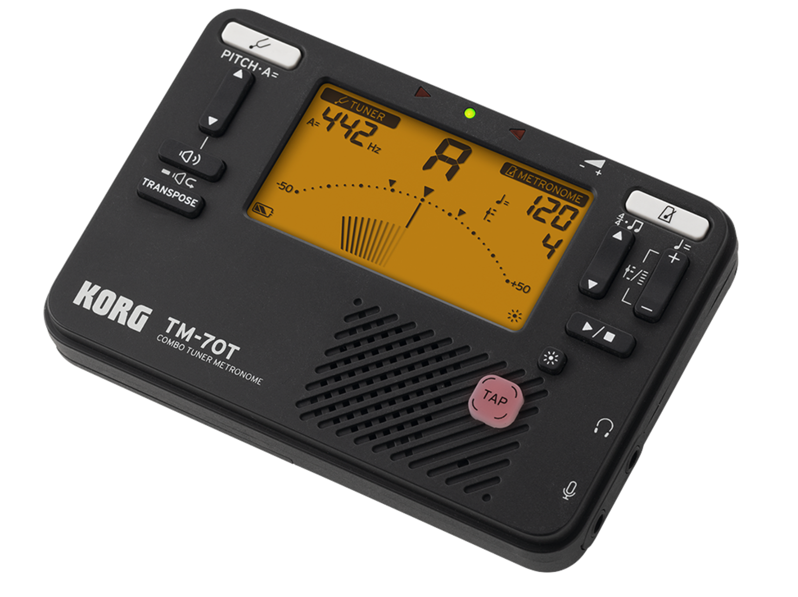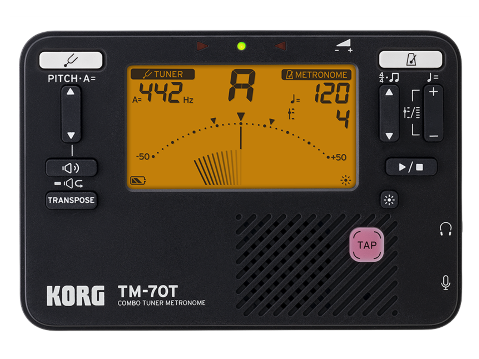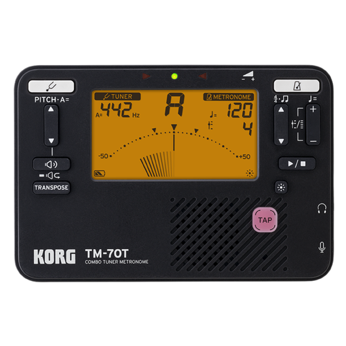 The new KORG TM-70TBK is a compact combo metronome and tuner that covers all the important aspects of learning and practising your instrument. Featuring both a tuner and broad ranging metronome the TM-70TBK is an all-in-one accessory all musicians must have. Featuring a wide detection range of C1–C8 to support a broad range of instruments from usual guitars to orchestral and band, LCD needle meter with excellent sensitivity and visibility, transpose function that allows switching between in F, in B♭ and in E♭ in addition to chromatic, Calibration is adjustable to match various concert pitches, Metronome features a wide tempo range from 30 to 252 beats/minute. Choose from three types of tempo settings and 15 rhythm variations, improved sound out and sound back audio for even clearer sound, Convenient memory backup function and auto power-off function and long battery life of up to 250 hours. With stylish design and reliable functionality, this is an indispensable Tuner/rhythm training aide for any musician, teacher, orchestral/band leader or studio. Oxygen Music is proud to stock many Korg products, including the Korg TM-70TBK Combo Tuner Metronome.