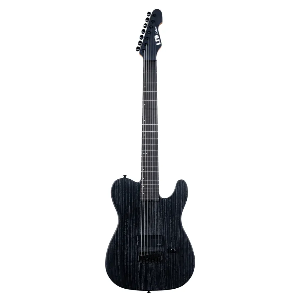 The LTD TE-1007 Baritone is a lesson in down tuned brutality with its 27"" Baritone scale, 7 string layout and high powered Fishman Fluence Modern pickups. Born from the fires of Mount Doom the TE-1007 has a body of Sandblasted Swamp Ash, a roasted maple neck and Macassar Ebony fretboard with 24 Stainless Steel Frets. The Hipshot Bridge keeps everything tidy with a flat playing surface and a resonant steel construction and the ESP locking tuners keep everything neat and in tune. Powered by a single Fishman Fluence Modern humbucker, the TE-1007 can vary from chuggadelic low end punch with the active voicing to the full musical roar of classic humbuckers with the passive attack mode. Oxygen Music stocks a great range of LTD guitars including the TE-1007 7 String Baritone Black Blast Electric Guitar.