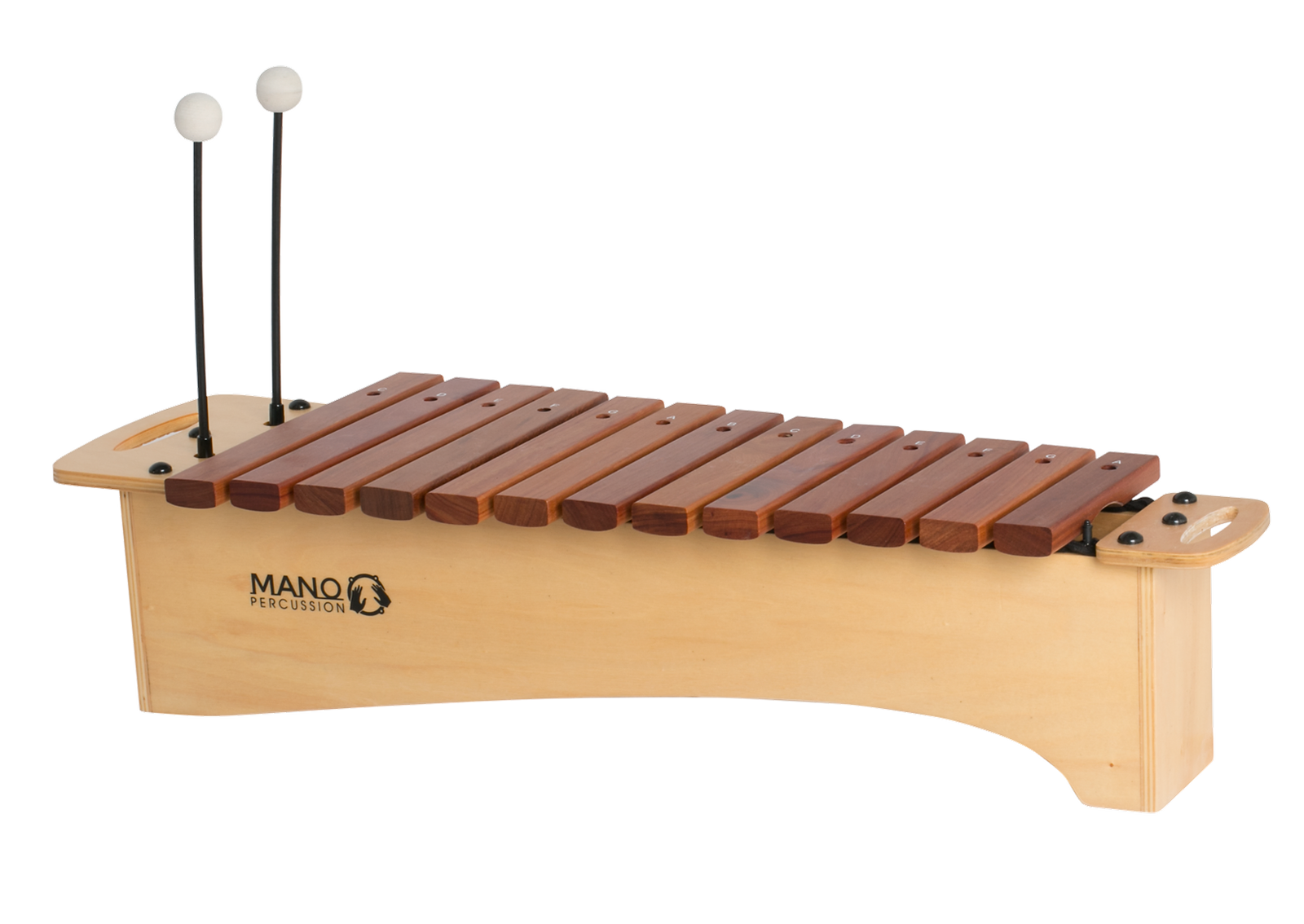 MANO PERCUSSION have become well know and established for quality educational percussion instruments. This Mano Percussion Soprano Diatonic 13 Note Wooden Xylophone UE825 is a very popular school band instrument and demonstrates an example of their quality products. The Mano Percussion Soprano xylophone features 13 beautifully and precisely crafted African Pau Rosa wooden bars tuned to diatonic notes from C5-A6 with well balance and tonally matched keys, providing the instrument with an authentic, warm and projecting xylophone sound. Also includes two F# bars and a single A#/Bb bar key to quickly convert the scale into F Major or G Major scale, carry handles, pair of mallets and carry bags for spare bars. The Mano Percussion Soprano Diatonic 13 Note Wooden Xylophone can be easily played on the floor or table top. OXYGEN MUSIC proudly stock are great range of school band ensemble and classroom music percussion instruments including the Mano Percussion Soprano Diatonic 13 Note Wooden Xylophone UE825