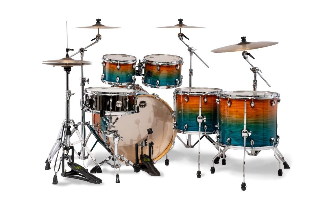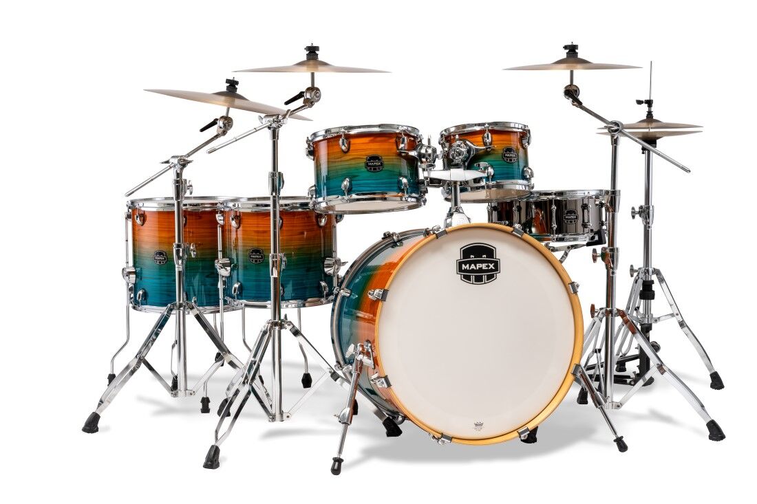 Mapex have long been involved in the innovation and development of high quality, professional drums, percussion and hardware. From Design Lab musical products that combine Artist, Engineering and Design collaboration, Mapex have consistently created and produced market leading instruments with sound and edginess as it's focus. The Armory range of drum kits set a high standard for professional quality drum kits, with not only amazing timber selection, construction, tonal sound and features, but they look outstanding, with a range of incredible lacquered finishes. Featuring 6ply Birch/Maple/Birch hybrid shells with Soniclear bearing edges for ultimate drumhead connection and solid steel tube lugs, Fast Shell Toms, Mapex Soniclear Suspension system and Soniclear floor tom legs, included Mapex Armory Tomahawk steel snare drum, virgin bass drum (no tom mount) for the ultimate thump all finished off in eye popping Olive wood veneer colourful finishes. For a real stand out drum kit on stage or in the studio, the Mapex Armory drum kit is the first choice for many professionals. Oxygen Music are proud to be Mapex stockists and have a large selection of drum kits, snare drums and hardware in store, including a selection Mapex drums like this Armory 6pce drum kit. 10-12-14-16-22-14sn, Finished in Ocean Sunset. Includes Hardware (Single Bass Pedal, Snare Stand, HH Stand, Boom Stand x2), no cymbals.