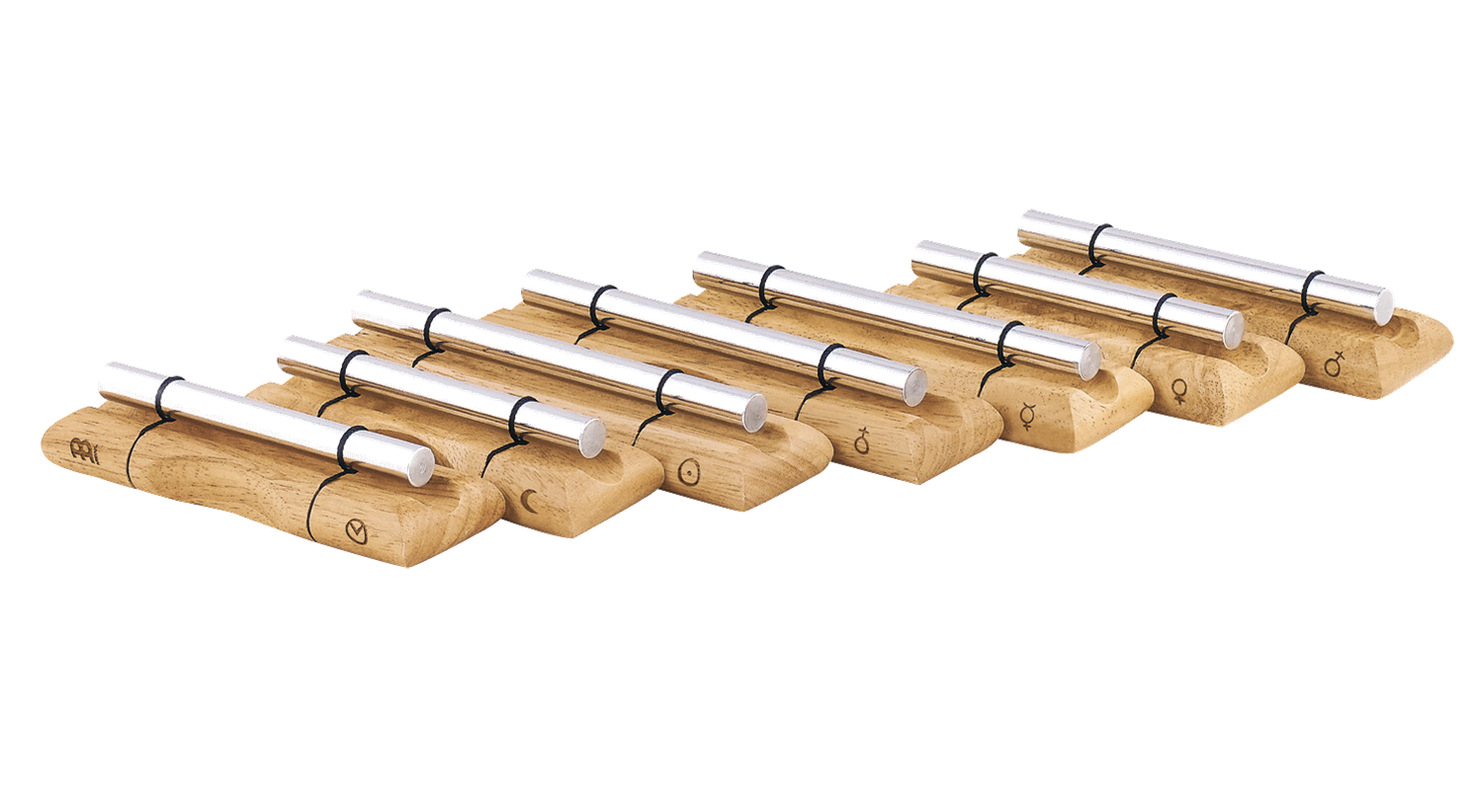 The MEINL Sonic Energy Range of Percussion Instruments is an expertly designed and carefully crafted range of wellness and healing percussion. Designed to allow the whole body to experience musical tones, frequencies and rhythms, the Sonic Energy range of percussion is used by professional music therapists worldwide to treat a whole range of health, stress and relaxation requirements. These Meinl Sonic Energy Chakra Energy Chimes are uniquely tuned utilizing the calculations of Hans Cousto (The Cosmic Octave) to match the frequencies of The Sun, moon, and planets. Each chime is tuned to create the celestial body's matching frequency and are used for meditation, healing, sound baths and yoga. Made with silver anodized aluminum alloy for an exact frequency. The decorative wooden base is finished with an engraved logo and tuning symbol, and each chime comes with a wooden mallet that produces a clear and defined note. Oxygen Music are proud to stock a range of Meinl Sonic Energy Percussion, including the 7Pc Chakra Energy Chime set. This set is Includes 7 Cotton protective bags and 7 beaters. EC-SET-CHA-7