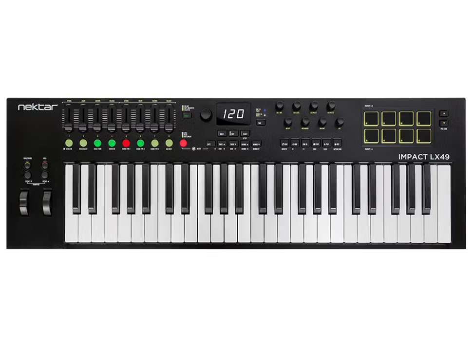 The Impact LX49 MK3 USB MIDI controller is the latest all-round MIDI Controller keyboard from NEKTAR jam-packed with intelligent and expressive performance control not even available on many premium products. One of the best expressive, compact controllers on the market that hooks up automatically to your DAW. The 49 note velocity sensitive keyboard is a synth action with a medium tension. The full-size, piano-style keys are covered to protect against dirt and dust while also complementing the Impact LX MK3 design. Featuring 49 full size keys, 9 full-resolution encoders with parameter control in one rotation, 8 faders, 8 velocity sensitive pads, 9 LED illuminated buttons, 22 additional buttons, 1/4″ TS footswitch jack, USB-C connection and power, DAW integration for Ableton Live Suite, Bitwig Studio, Cakewalk/Sonar, Cubase (13 or higher), FL Studio, Garageband, Nuendo,, Logic Pro (10.8 or higher), Reason, Reaper and Studio One (5 or higher), Works in any DAW and is compatible with thousands of plugins and includes NI Komplete Select 15 , Bitwig Studio 8-track DAW and MOK Miniraze plugin synth. The NEKTAR Impact LX49 Mk3 is the perfect small sized controller keyboard that is ready to go in any studio or production suite for your own customized control. Oxygen Music is proud to stock Nektar products, including the LX49 MK3 49 note USB MIDI Keyboard Controller.