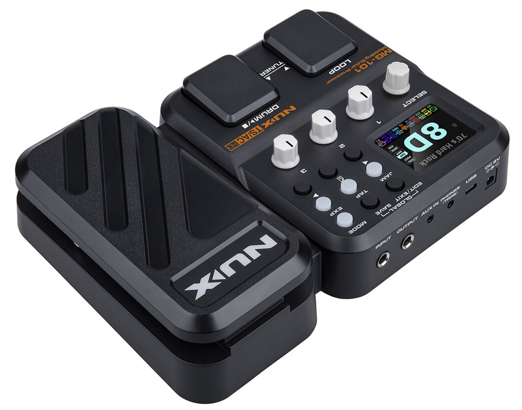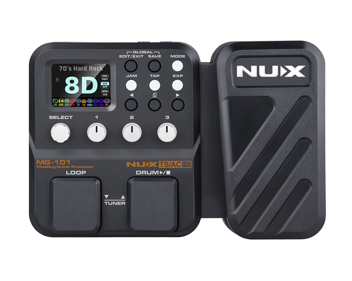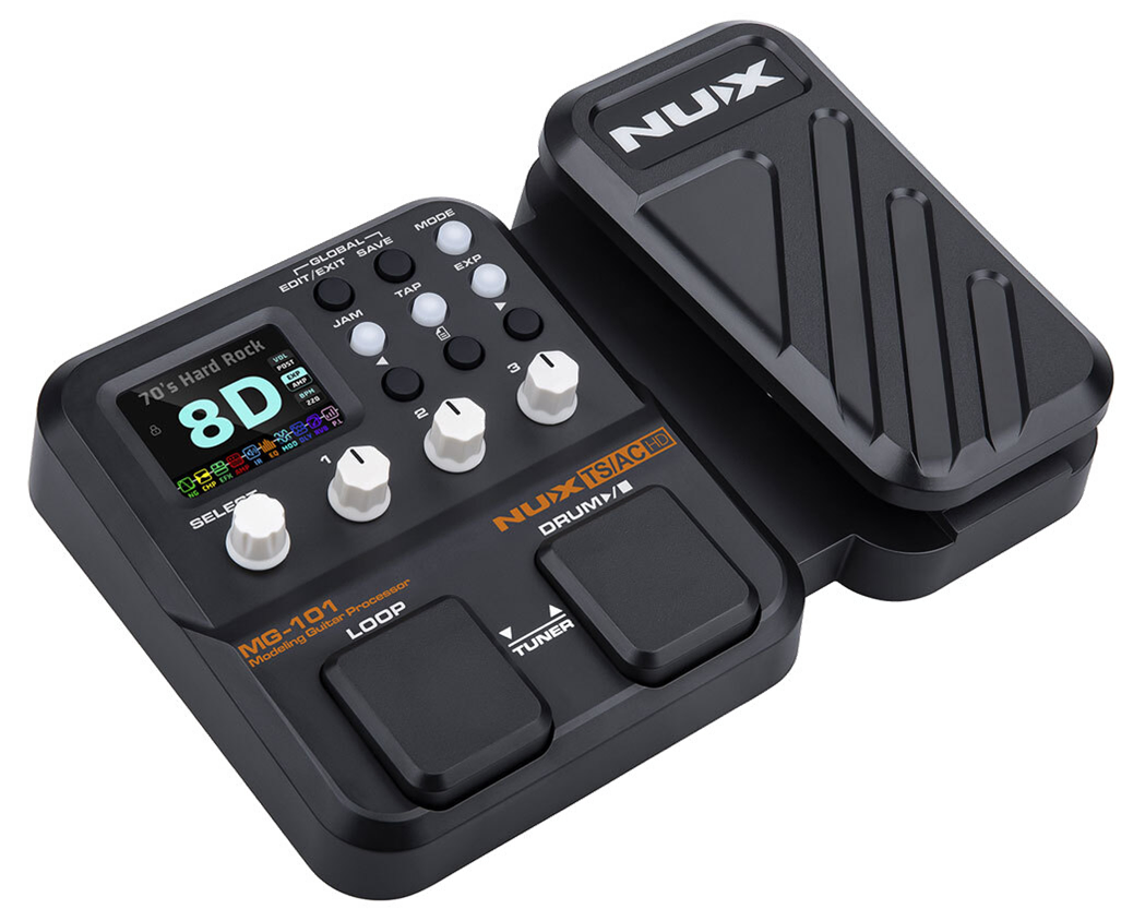 For the ultimate affordable floor effects processor the NUX MG101 offers guitarists all the most popular and essential guitar effects in one compact and easy to use unit. The NUX MG101 Multi Effects Guitar Processor delivers guitarists a loaded processor with a huge range of modern and classic effects and amp simulations ready for all styles of music. Whether you're after an amp simulation, stomp box or any other typical effect such as reverbs, tremelos, phaser, chorus, delays, overdrive or a classic sounding distortion, the NUX MG101 is packed with 25 of the best classic amp models, 512 samples IR resolution and USER slot with each patch, huge 10 blocks of effects types (Lush Reverbs, Delays, Overdrives, Dist, and more), 3 band vintage EQ on each amp, 6 band graphic EQ, 72 preset patches (36 factory and 36 User) provide you with more than enough choices in your library of sounds and unique settings, Drum Machine and Prase Looper (up to 20 seconds stereo/40 second mono looper) adds a new dimension to your performance abilities by creating the possibility of a one-man-band set up, 5 output modes with 3 band EQ for quick tone tweaking, Tap-tempo, Auxillary Input and 2.4" 320 x 240 colour LCD with intuitive Ul. The NUX MG101 is perfect as a live streaming rig, ready to connect with your phone via USB. Can run off AC adaptor or battery. The NUX MG101 is the perfect addition to your guitar and studio set up for quick and easy addition of effects and amp sounds. Oxygen Music proudly stock a wide selection of NUX guitar and effects pedals, including the NUX MG101 Multi Effects Guitar Processor Pedal.