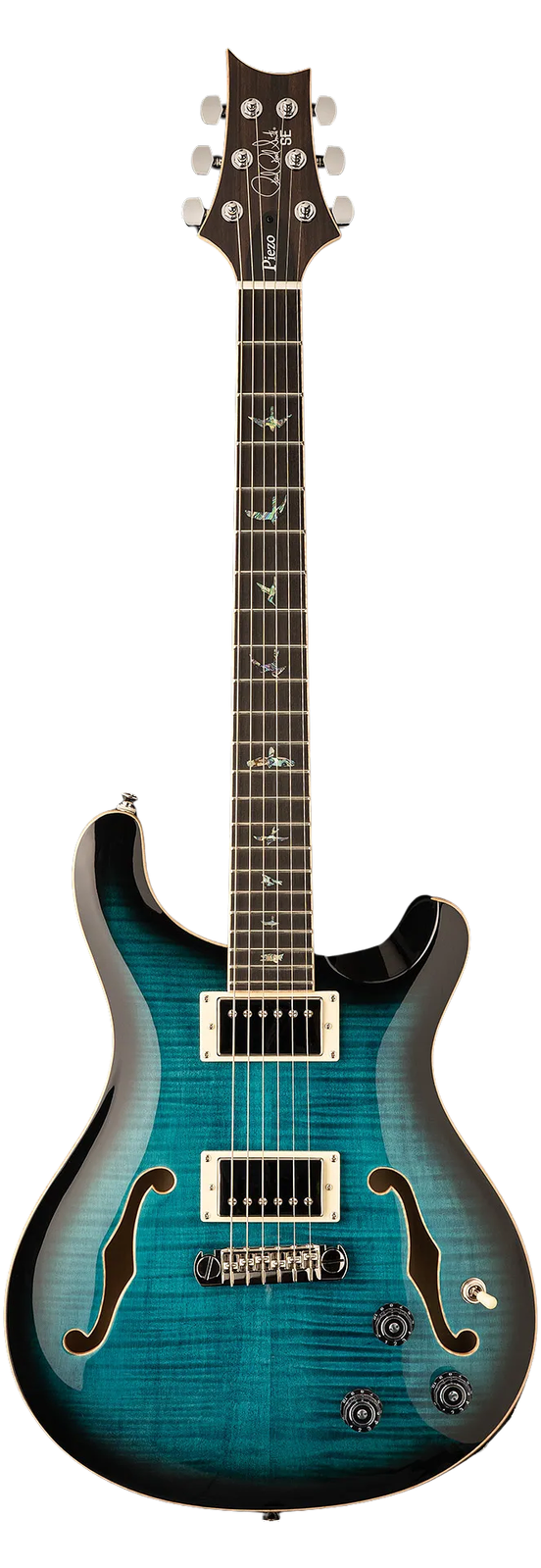The SE Hollowbody II Piezo sits at the crossroads between solid-body power and stability, and the captivating resonance of a hollowbody. The figured maple top and back and matching headstock combine with the double bound body to make the Hollowbody II an undeniably striking instrument. The mahogany sides and neck provide a big, musical sound via the 58/15 LT "S" pickups while the under-saddle Piezo pickup gives you the airy sound of an acoustic guitar. Solid-body, semi-hollow and hollow-body players will all feel at home on this classy, yet modern guitar. Oxygen Music is proud to stock a wide range of PRS guitars including the SE Hollowbody II Piezo in Peacock Blue Burst.