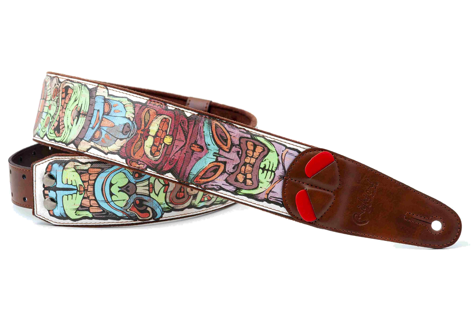 RIGHT ON Guitar Straps are a uniquely designed and handmade range of guitar straps with a commitment to sustainable and environmentally friendly Vegan manufacturing process, using up to 99% recycable materials and 100% animal free product. Made in Spain, the Right On Guitar Strap range is one of the most comfortable strap you'll find on the market. From wide, thick padded straps to suit heavy basses and electric guitars, to classic style straps for acoustic guitars and narrow straps better suited to folk instruments such as Ukuleles, you'll find a beautifully crafted design and style to suit. This Right On Mojo Tiki White guitar strap is inspired by the gods in Hawaiian and Polynesian mythology and features a high quality printing technique design and material, non-slip technical microfiber inner material, providing excellent grip on the shoulder, adjustable from 100cm to 145cm and 2.38 Inch (6cm) wide, 5mm thick high density latex padding for amazing comfort. Pick holder pockets included. Oxygen Music are proud to stock a wide range of Right On Guitar Straps like this unique Mojo Tiki White Guitar Strap.