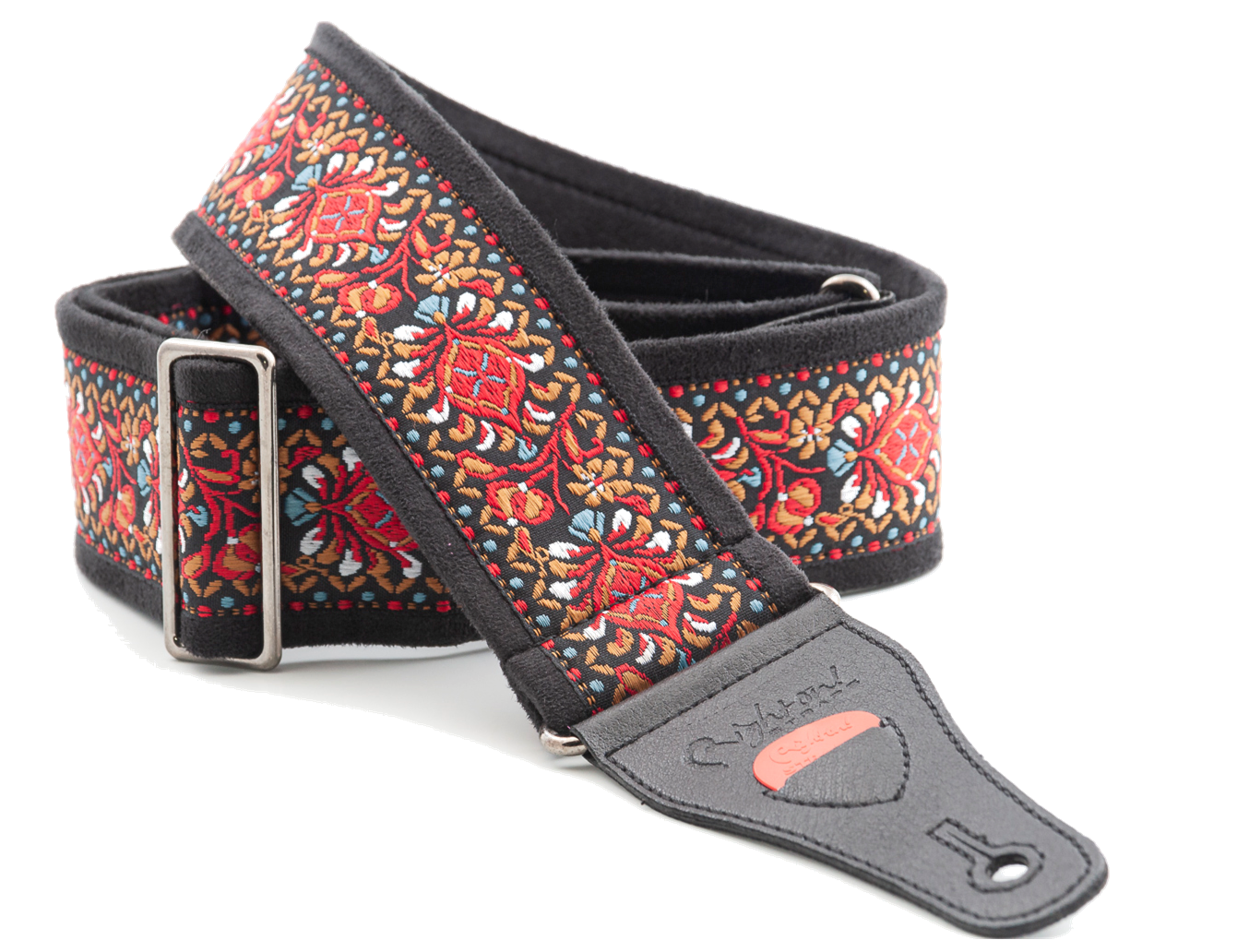 RIGHT ON Guitar Straps are a uniquely designed and handmade range of guitar straps with a commitment to sustainable and environmentally friendly Vegan manufacturing process, using up to 99% recycable materials and 100% animal free product. Made in Spain, the Right On Guitar Strap range is one of the most comfortable strap you'll find on the market. From wide, thick padded straps to suit heavy basses and electric guitars, to classic style straps for acoustic guitars and narrow straps better suited to folk instruments such as Ukuleles, you'll find a beautifully crafted design and style to suit. This Right On Standard Plus Woodstock II guitar strap features a classic Jacquard weaving design, non-slip technical microfiber inner material, providing excellent grip on the shoulder.adjustable from 90cm to 150cm and 2.38 Inch (6cm) wide 2.5mm thick high density latex padding for amazing comfort. Pick holder pockets included. Oxygen Music are proud to stock a wide range of Right On Guitar Straps like this unique Standard Plus Woodstock II Red Guitar Strap.