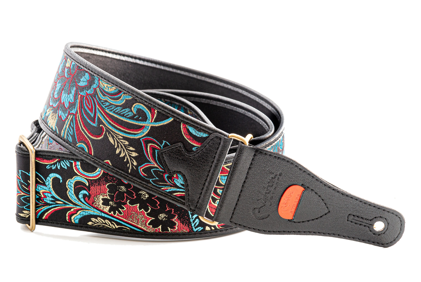 RIGHT ON Guitar Straps are a uniquely designed and handmade range of guitar straps with a commitment to sustainable and environmentally friendly Vegan manufacturing process, using up to 99% recycable materials and 100% animal free product. Made in Spain, the Right On Guitar Strap range is one of the most comfortable strap you'll find on the market. From wide, thick padded straps to suit heavy basses and electric guitars, to classic style straps for acoustic guitars and narrow straps better suited to folk instruments such as Ukuleles, you'll find a beautifully crafted design and style to suit. This Right On Talisman Beppu II guitar strap is inspired by the Japanese city of hot springs, with incredible embroided botanical motifs, adjustable from 95cm to 150cm and 2.38 Inch (6cm) wide heavy duty padding. Pick holder pockets included. Oxygen Music are proud to stock a wide range of Right On Guitar Straps like this unique Talisman Beppu II Guitar Strap.