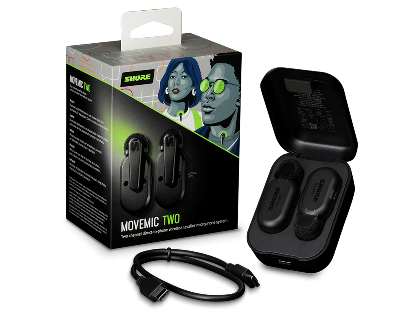 Two-channel wireless microphone for mobile set that pairs directly with your iOS or Android device using the Shure MOTIV video or audio apps. 24 hours of recording on the go: MoveMic lavaliers provide eight hours of battery life within the microphone, with an additional two full charges ready in the convenient charging case. MoveMic Two offers instant setup and connectivity, enabling you to record in seconds without missing a beat. Have the potential of receiver-free wireless, with two channels of high-quality audio transmitted directly to your phone. Utilizing a custom acoustic design and proprietary wireless software, MoveMic achieves broadcast-quality audio quality beyond traditional mobile devices. The free ShurePlus MOTIV apps allow you to customize your audio and video settings for optimal recording. Configure gain, limiter, EQ, compression, noise reduction and record within the apps. Add the MoveMic Receiver (sold separately) for added compatibility with DSLR and mirrorless cameras, computers, as well as popular third-party mobile apps. Rated IPX4, MoveMic Two is designed to withstand rain, spills and splashes, ensuring your content is not limited by environmental conditions.Oxygen Music is proud to stock a wide selection of quality, professional microphones, including the Shure MoveMic Two Dual Wireless Transmitter Lavalier Microphones. Includes 2 Wireless Mics, USB-C cable and Charging Case. SHR-MV-TWO-Z6