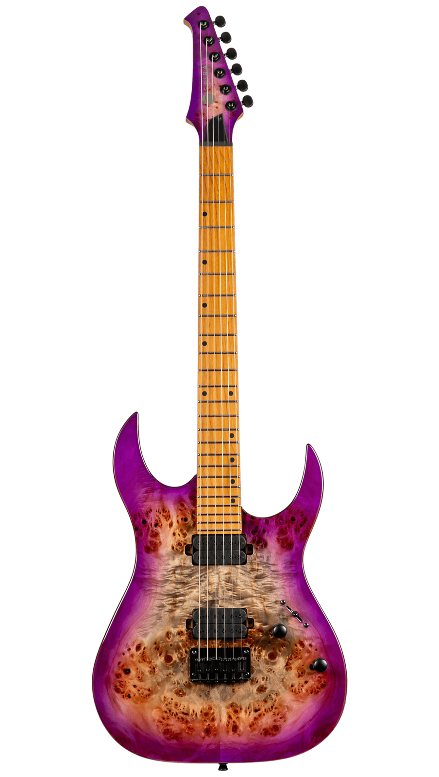 The S-450TPP is a high-performance rock machine built for players who demand exceptional tone and eye-catching style. Its roasted poplar body is paired with either a glossy maple or striking spalted poplar top, giving it both durability and stunning visual appeal. A Canadian roasted maple neck with a modern D profile and matching roasted maple fretboard delivers a fast, comfortable playing feel that’s perfect for ripping solos and heavy riffs. Equipped with Spira’s custom Villain™ humbuckers, the S-450 pumps out powerful, articulate tones that excel in rock and metal. A fixed bridge and black locking machine heads provide rock-solid tuning stability and precision. With 24 jumbo frets on a 14” radius fretboard and a 25.5” scale length, this guitar offers effortless playability across the entire neck. A double-action truss rod and bone nut further enhance its strength and performance, making the S-450 as reliable as it is inspiring. Oxygen Music stocks a great range of Spira guitars including the S-450 Transparent Purple Burst Electric Guitar